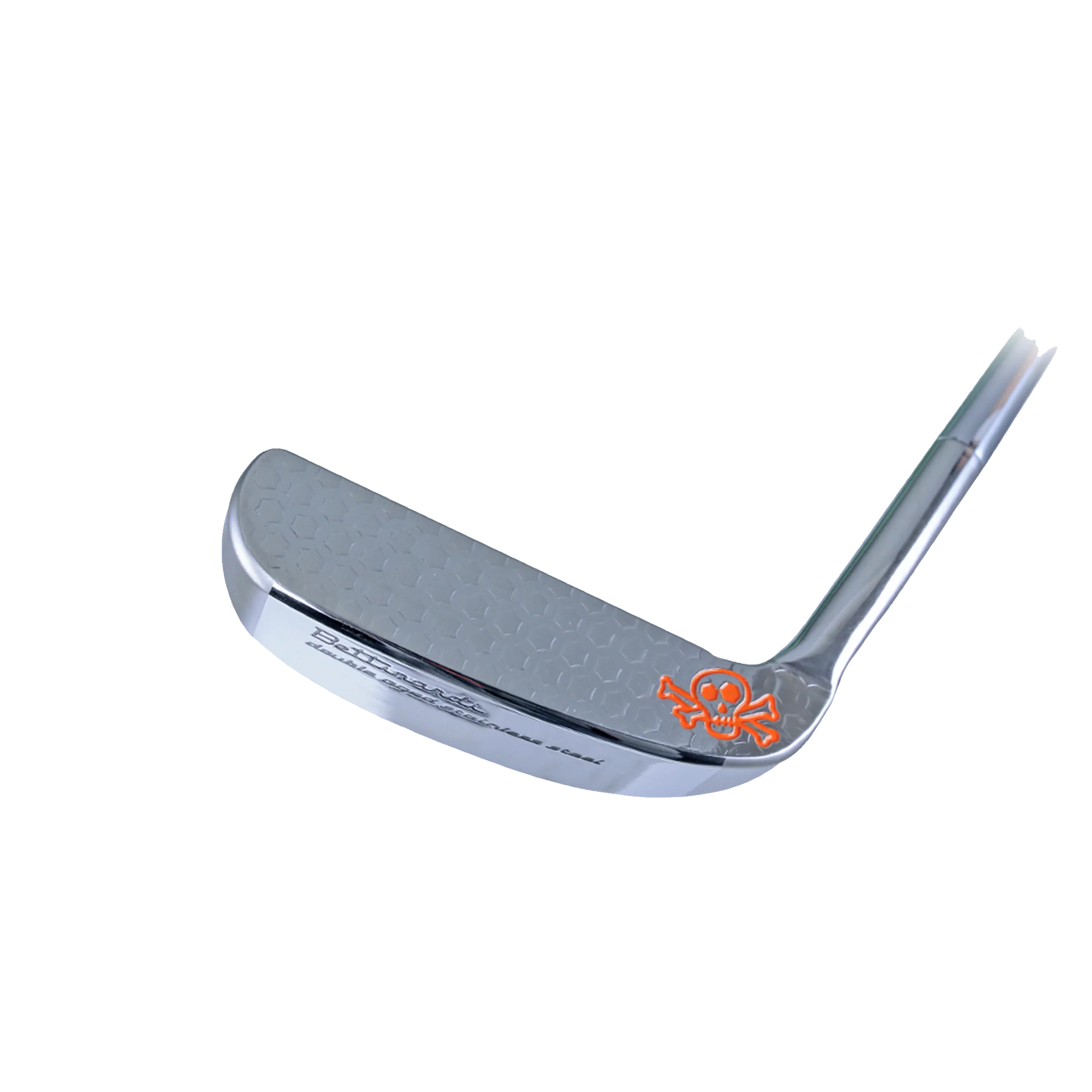Blade lovers, look no further than this Skull and Cross Bone BB2 milled from Double Aged Stainless Steel. The BB2 is one of Robert’s favorite head styles, and seldom available on Tour. The Tour blasted flange in combination with a high polish Honeycomb face milling and sole makes for a timeless look, and comes paired with a matching mini-blade tour headcover, black shaft, and matching leather grip-master grip.