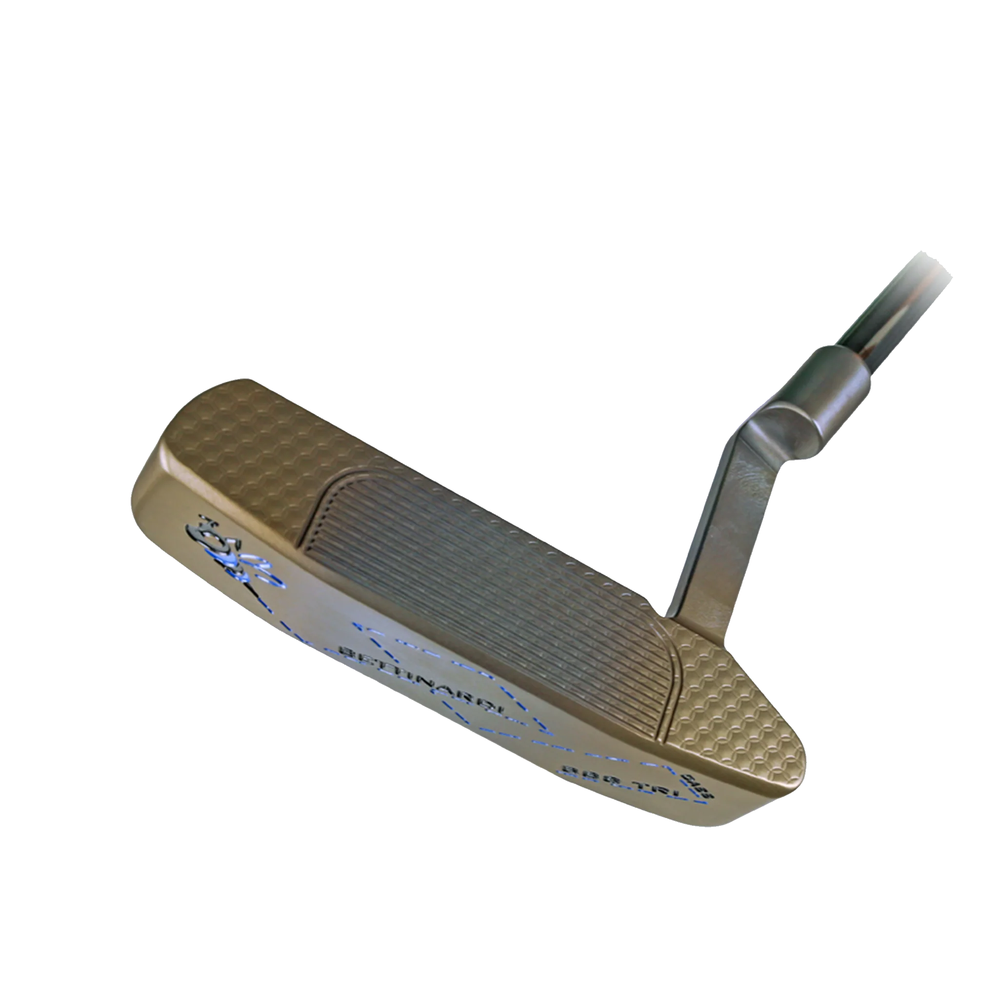 This BB8 Tri-Plane milled from DASS in a hand torched gold flame finish with subtle hues of blue feels just as good as it looks. A single stinger bee tucked in the right corner of the pocket with Honeycomb bumpers adds to the craft on display, while the sole features a buzzing bee that is on the move! Paired with a matching Stinger cover, black shaft, and black leather grip master grip, putters like this are available only in The Hive.