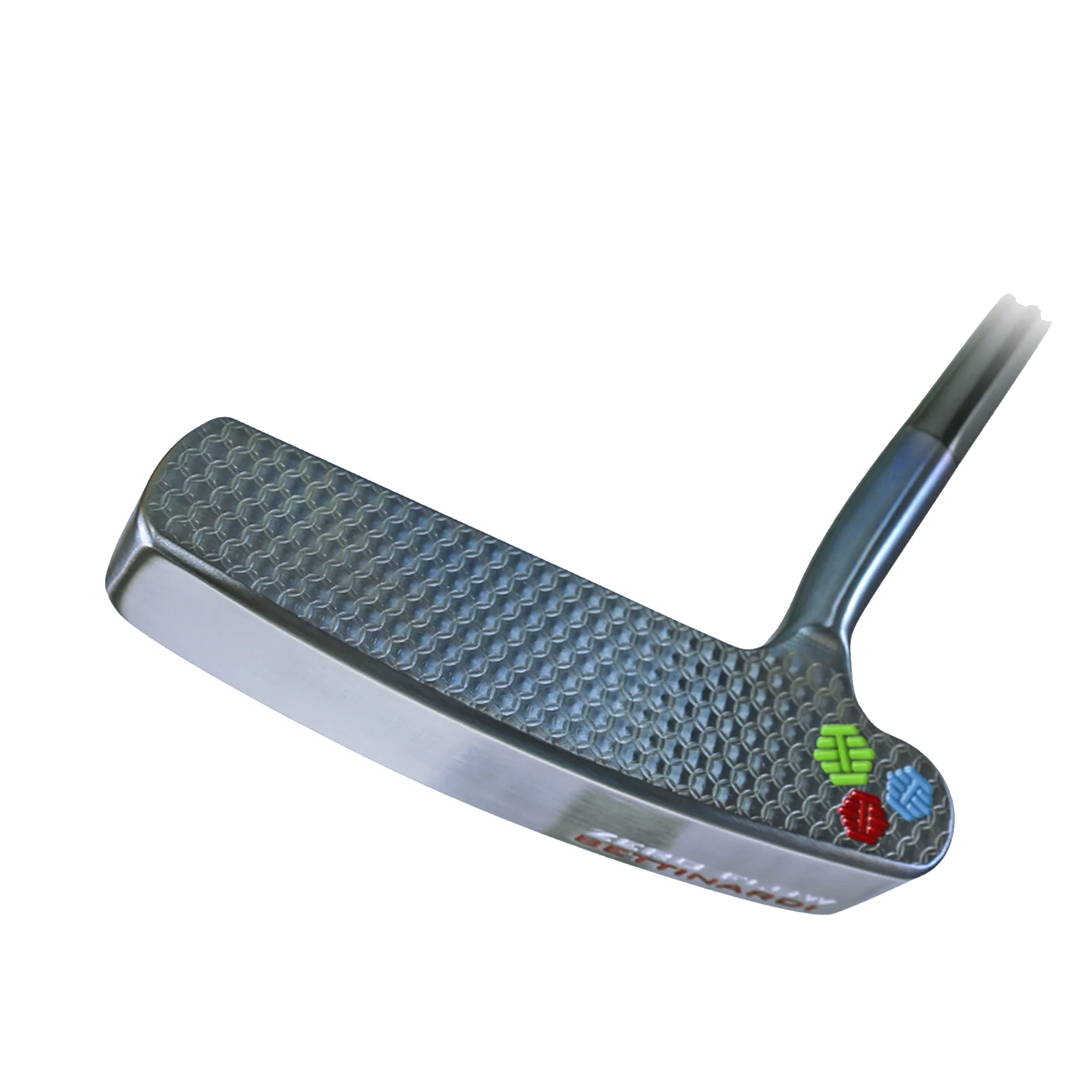 This Zero Flow in DASS in a blue flame finish is a knockout on so many levels. Multi colored Stinger Bee’s and T Hives dancing in the pocket and on the heel make this cleanly polished Zero Flow eye candy from the start. The Micro Honeycomb milled bumpers add to the craft of this beauty, which matches the face milling precisely. Paired with a matching Tour Only headcover and black leather gripmaster grip, available only in The Hive.