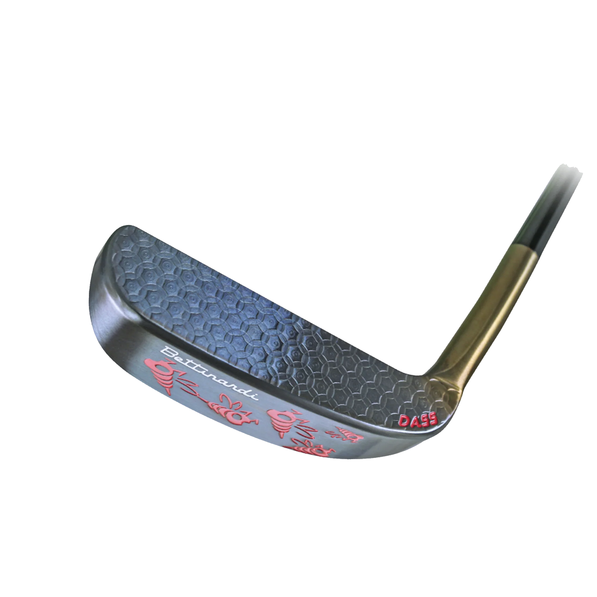 This newly released DASS BB2 has such a clean look from address, with no visual alignment aids distracting from this classic hand-polished blade. The two-tone finish is stunning, featuring a blue flamed body and a gold flame neck which really pops over the classic Honeycomb face milling. The party starts when you look at the sole with the dancing stinger bees painted in a hot pink paint fill. Weighing in at 357 grams, this one-off blade comes paired with a matching black leather gripmaster grip and mini-blade custom headcover.