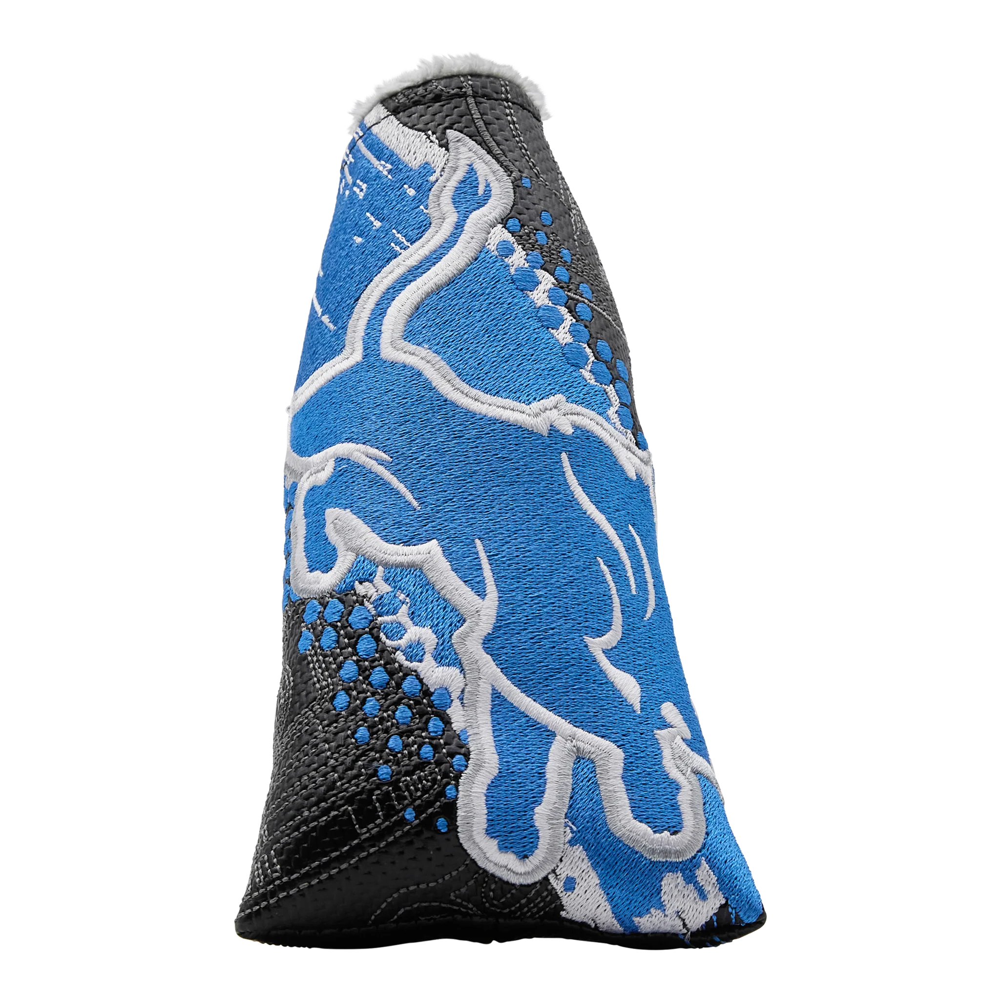 One Pride! This Detroit Lions Blade Putter Headcover features a Detroit Lions' lion on the front on top of a black motor themed base. Finished with a magnetic closure and grey plush interior. Limited quantities are available.