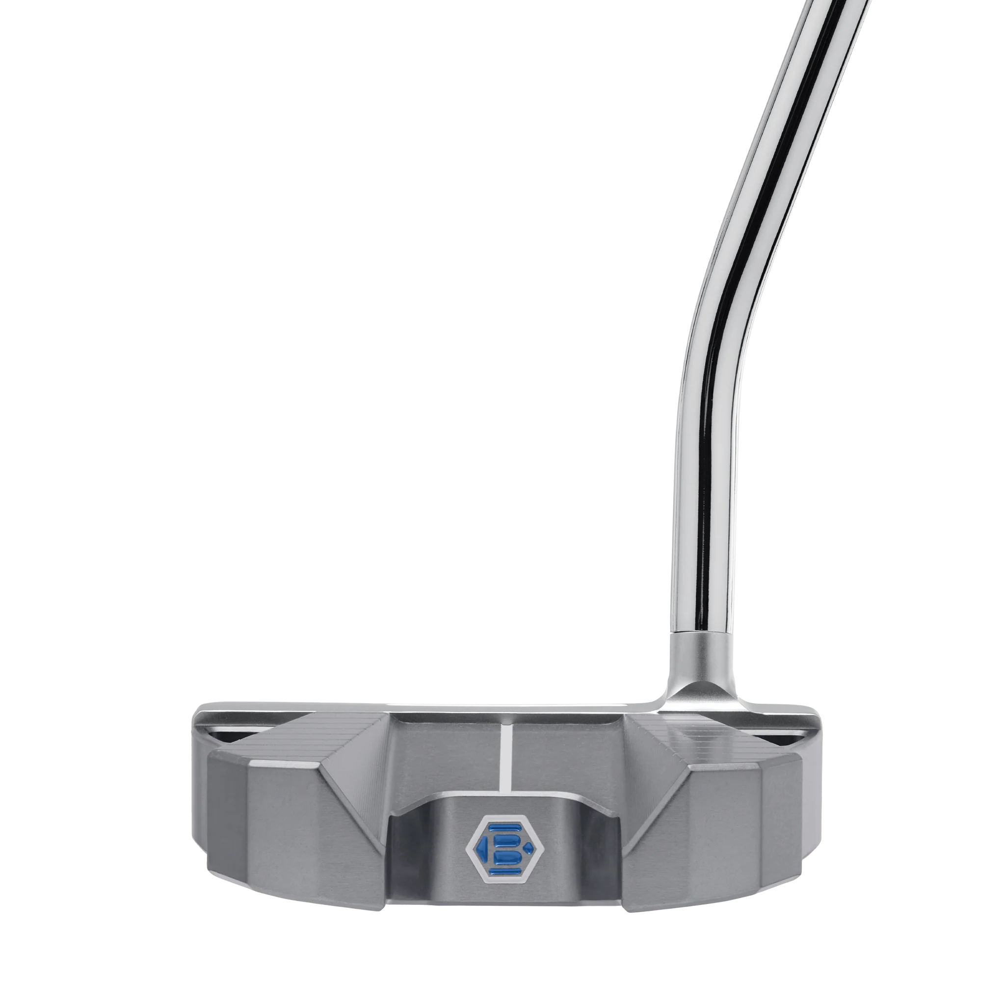 Robert crafted his new lefty INOVAI 6.5 Spud neck with a combination of the finest American 303 Stainless Steel and Military Grade 6061 Aluminum. The Tour Blasted front piece includes our F.I.T. face milling for the softest feel at impact, ideal for the player with an aggressive putting style. The Gun Metal Gray Anodized back piece includes muscular fangs that form a perfect hex cut-out and stark sightlines that provide alignment visuals to help keep the putter head moving toward the target. The two triangular vents help optimize the MOI and the 5-plane sole helps the putter sit beautifully at address. This putter was precision-milled to 354 grams & features a Honeycomb milling pattern on the sole that completes the trademark Bettinardi look. The INOVAI 6.5 putter features a sleek gray, blue, and white color scheme and comes perfectly paired with a matching white & gray honeycomb headcover and a blue Lamkin grip.